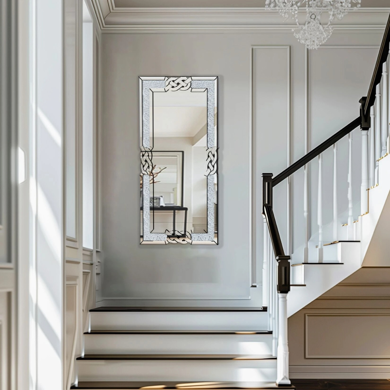 Bring a sense of luxury and sophistication to your home with this stunning crushed diamond wall mirror. Designed to captivate and add an elegant flair, this rectangular mirror features a sparkling crystal inlay around its edge, creating a dazzling effect that instantly enhances any room. Whether you’re looking to add glam to your living room, entryway, or bedroom, this mirror brings a touch of chic, glamour, and depth to your decor, transforming any space with its bling effect.