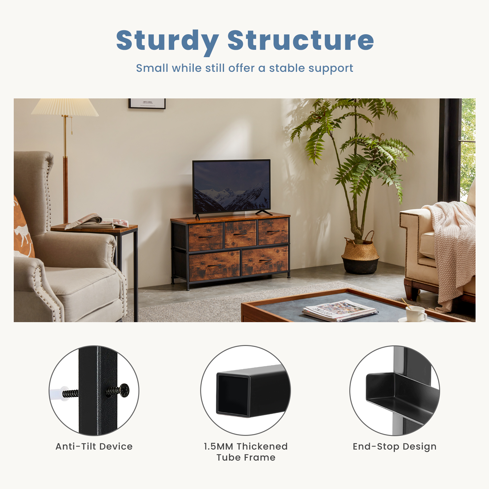 Built with durability in mind, this fabric dresser features a sturdy steel frame and a smooth, scratch-resistant wooden top, providing a stable and secure structure. The five spacious fabric drawers come in two different sizes to offer versatile storage options, while the premium MDF board top can support up to 66 lbs—perfect for holding lamps, books, or décor. Its anti-toppling accessories and reinforced steel frame ensure extra safety, making it ideal for families with children.